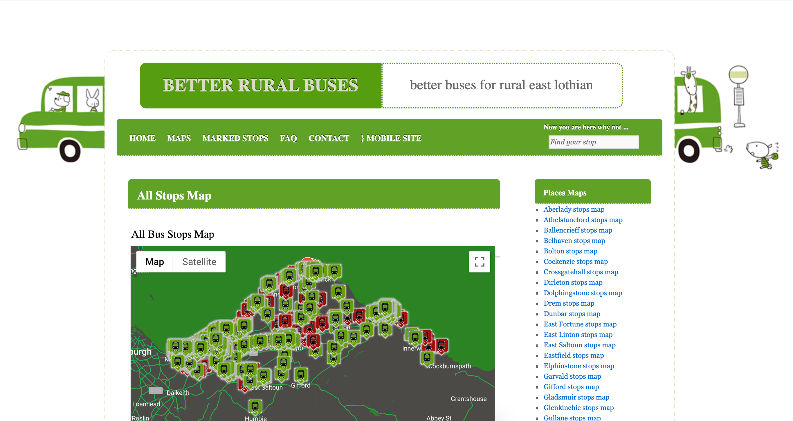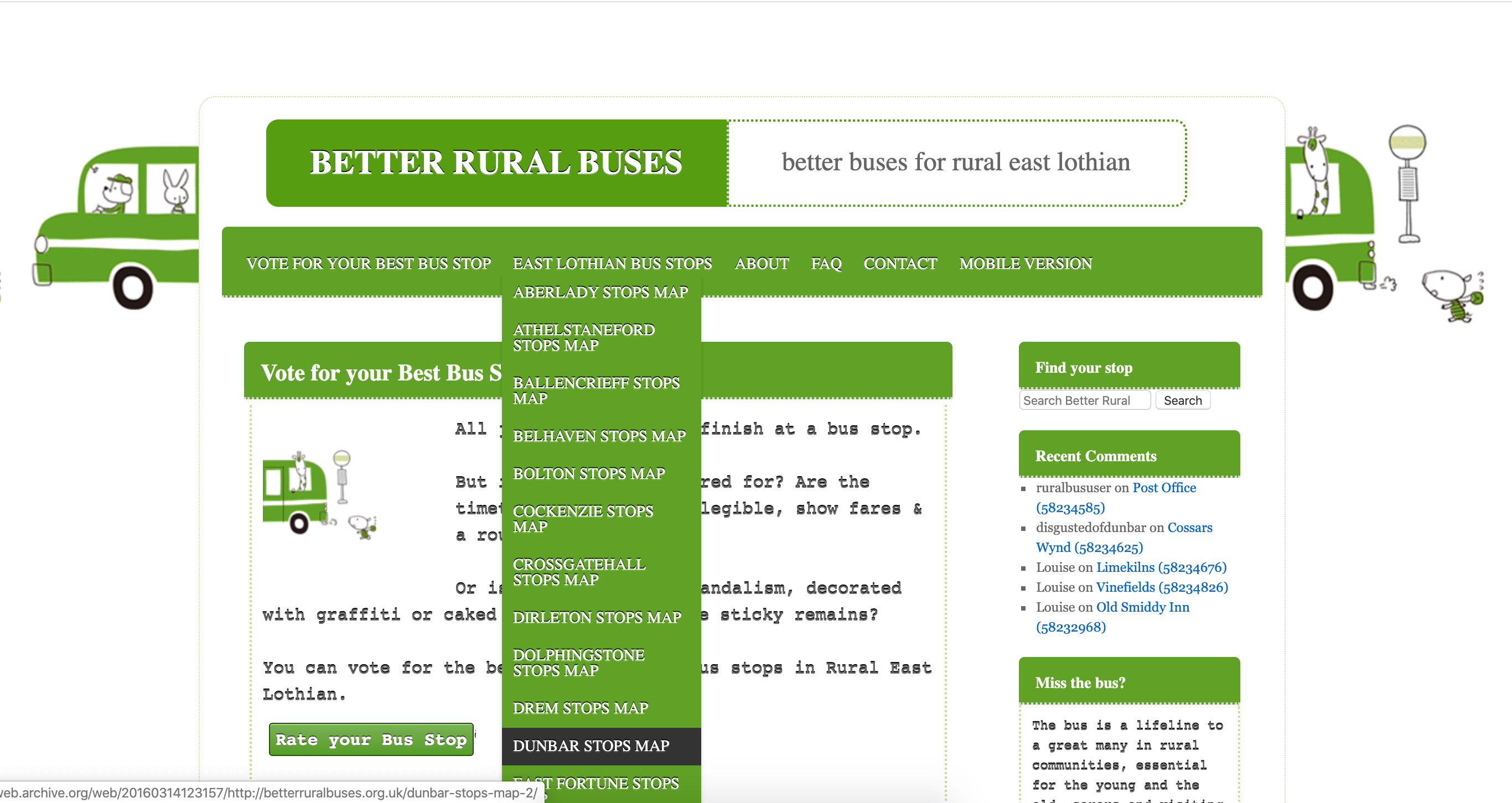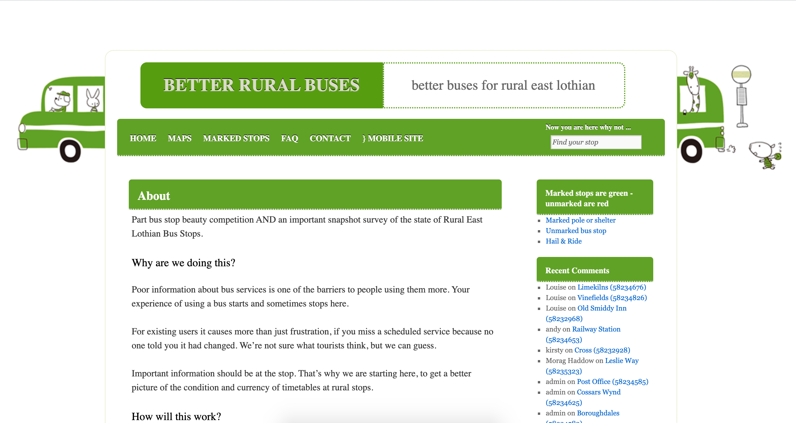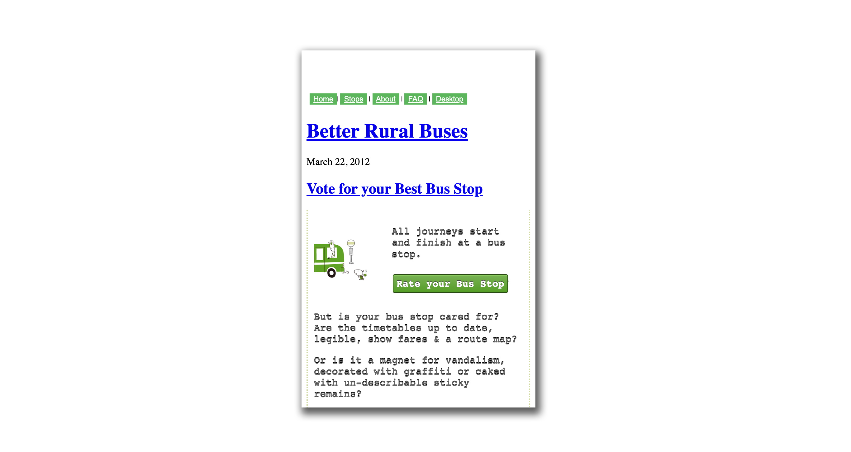 Originally a free standing website, Better Rural Buses was ported over to Ourlocality.org when the domain was due to expire, to keep the project as a demonstration. Now it is only available as fragments via the Web Archive project.