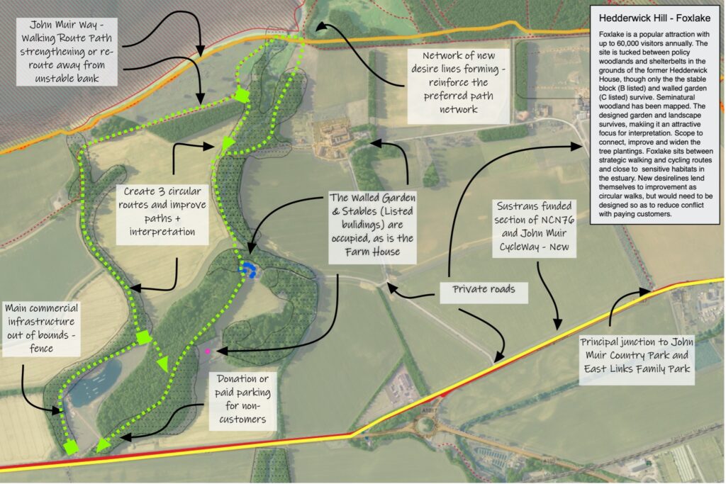 Proposals are mapped out for a number of priority areas including most of John Muir Country Park down to Barns Ness SSSI. Considerable co-operation between stakeholders and residents will be necessary, but bilateral agreements with a small number of private landowning interests are going to be key. Rather few “green blue spaces” are in community ownership and although the Open Spaces strategy suggests otherwise, in our view accessibility to green and blue space is often constrained and may be a factor that encourages more motorised visits than is desirable.